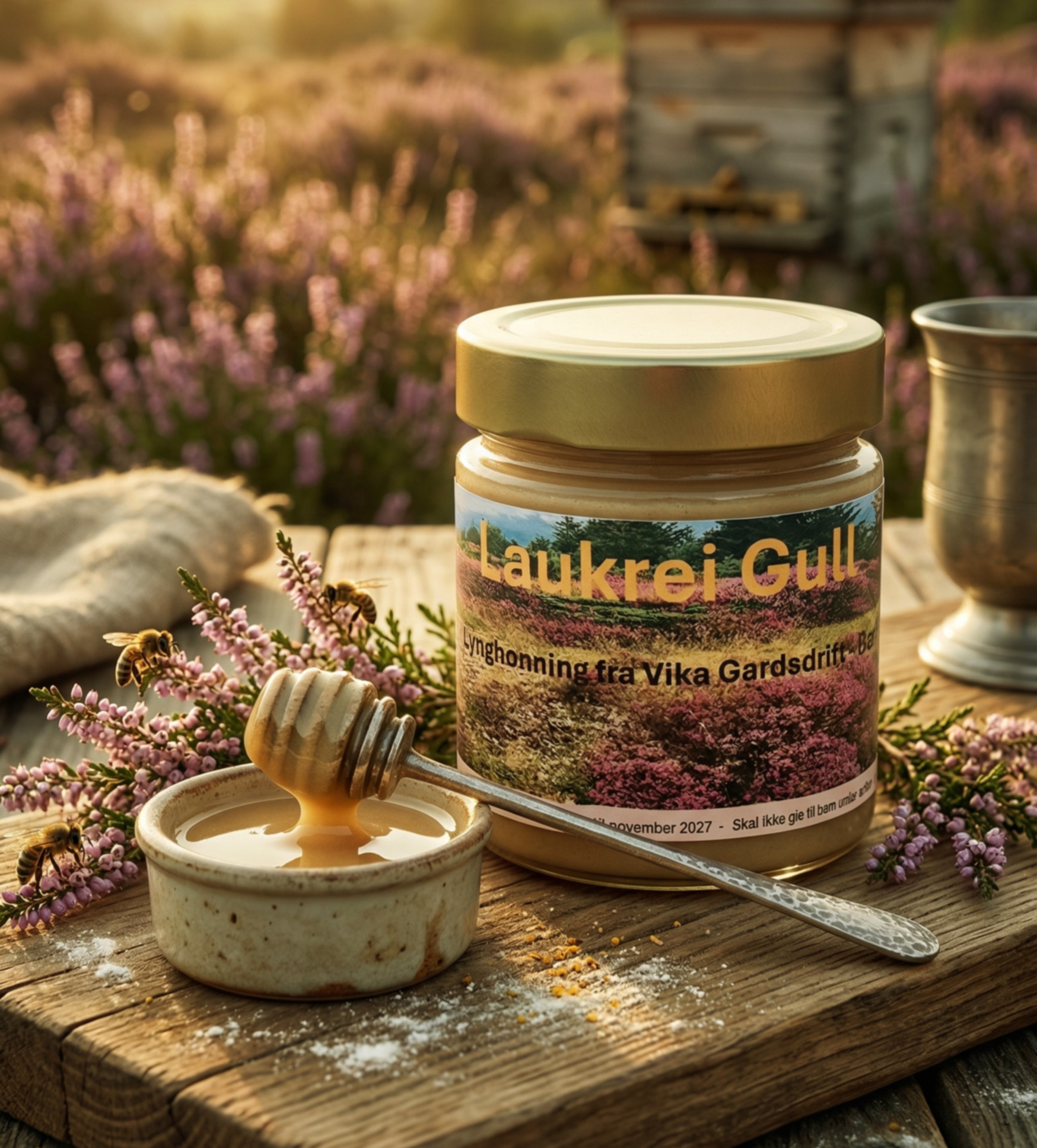 Laukrei Gull er ein smakfull lynghonning frå Vika Gardsdrift, hausta frå kystlyng i norsk natur. Denne typen honning er kjend for sin mørke farge, fyldige konsistens og karakteristiske smak med lett bitre og aromatiske tonar.