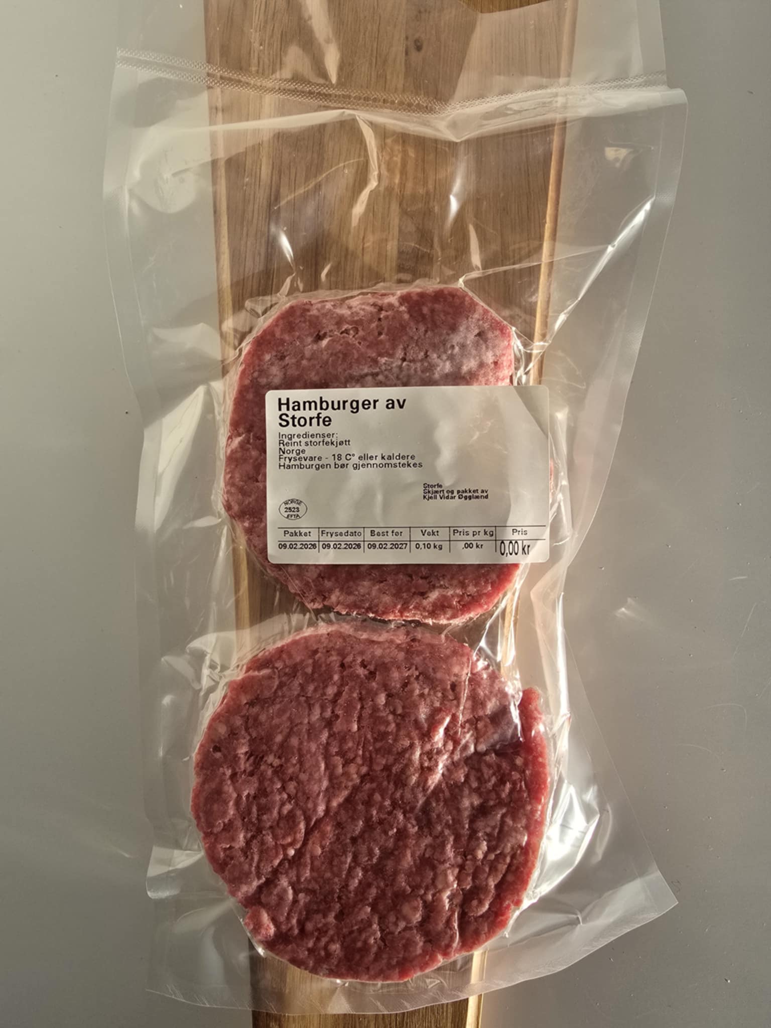 Dette er ikkje ein standard industriburger. Det er skikkeleg kjøt, forma til burger.